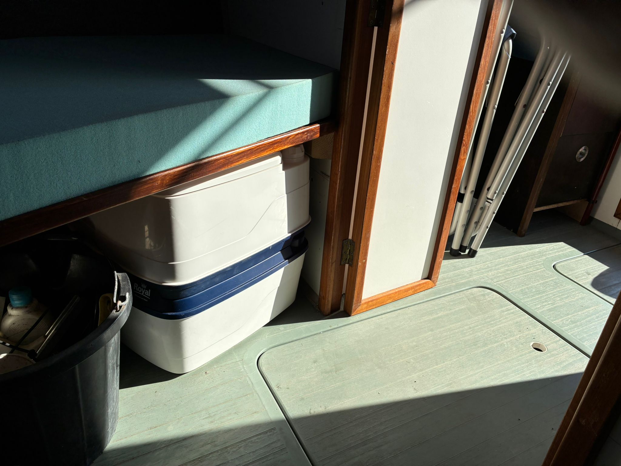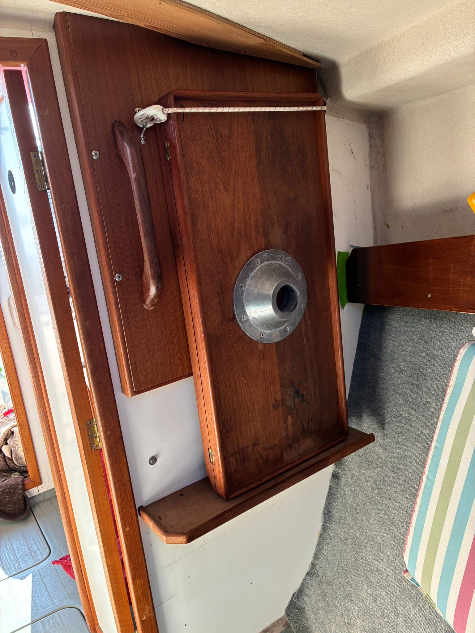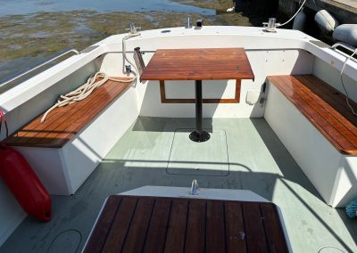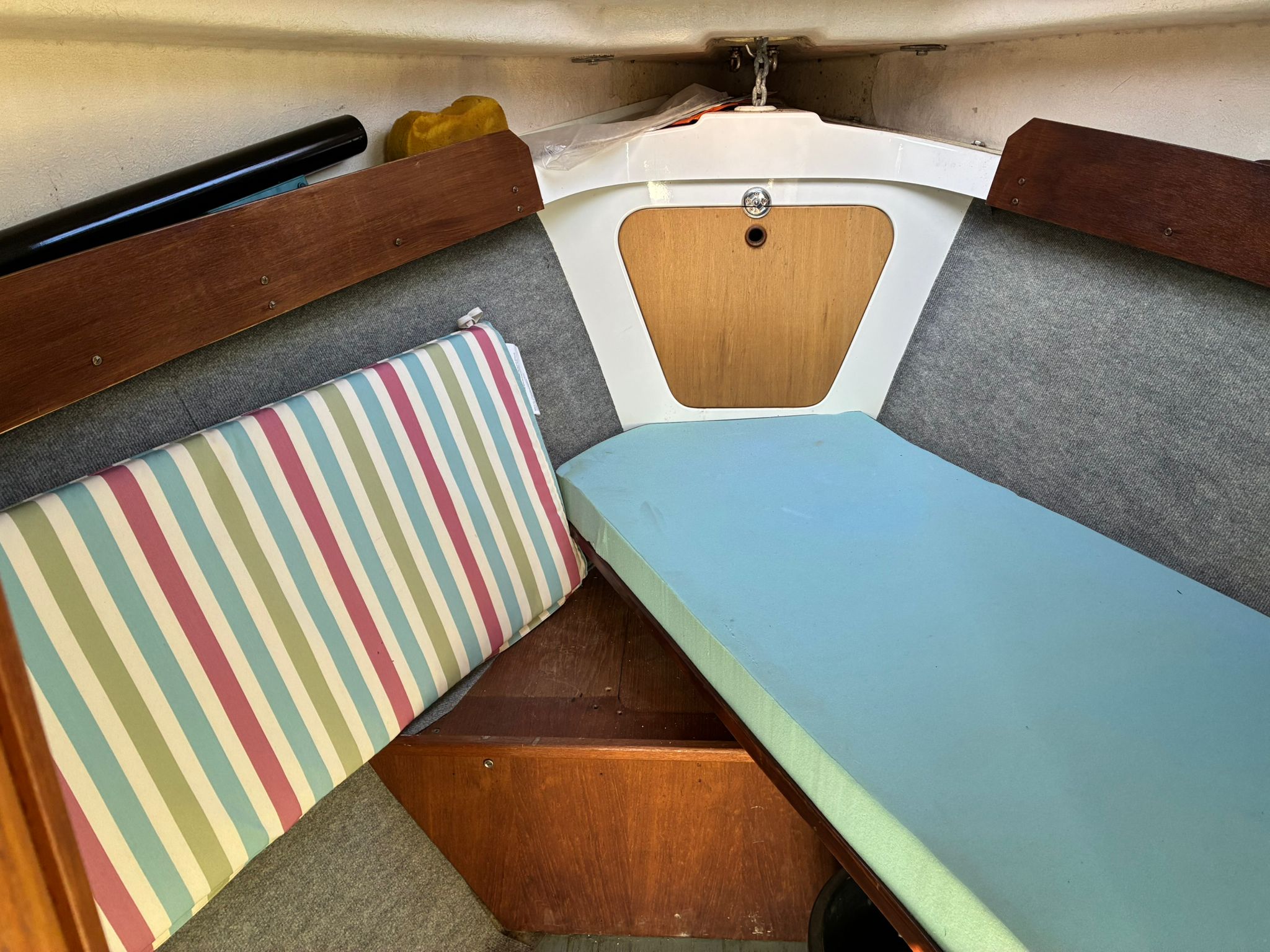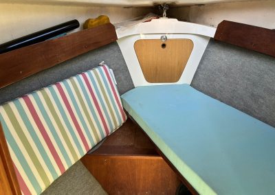 Cabin: Has a Vetus hatch that allows access to the foredeck. Single bunk with disposable toilet stored beneath. Self-draining anchor lockers for warp and chain. Also has a folding Teak table and support post.
