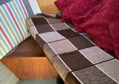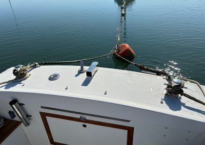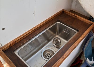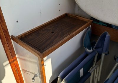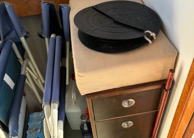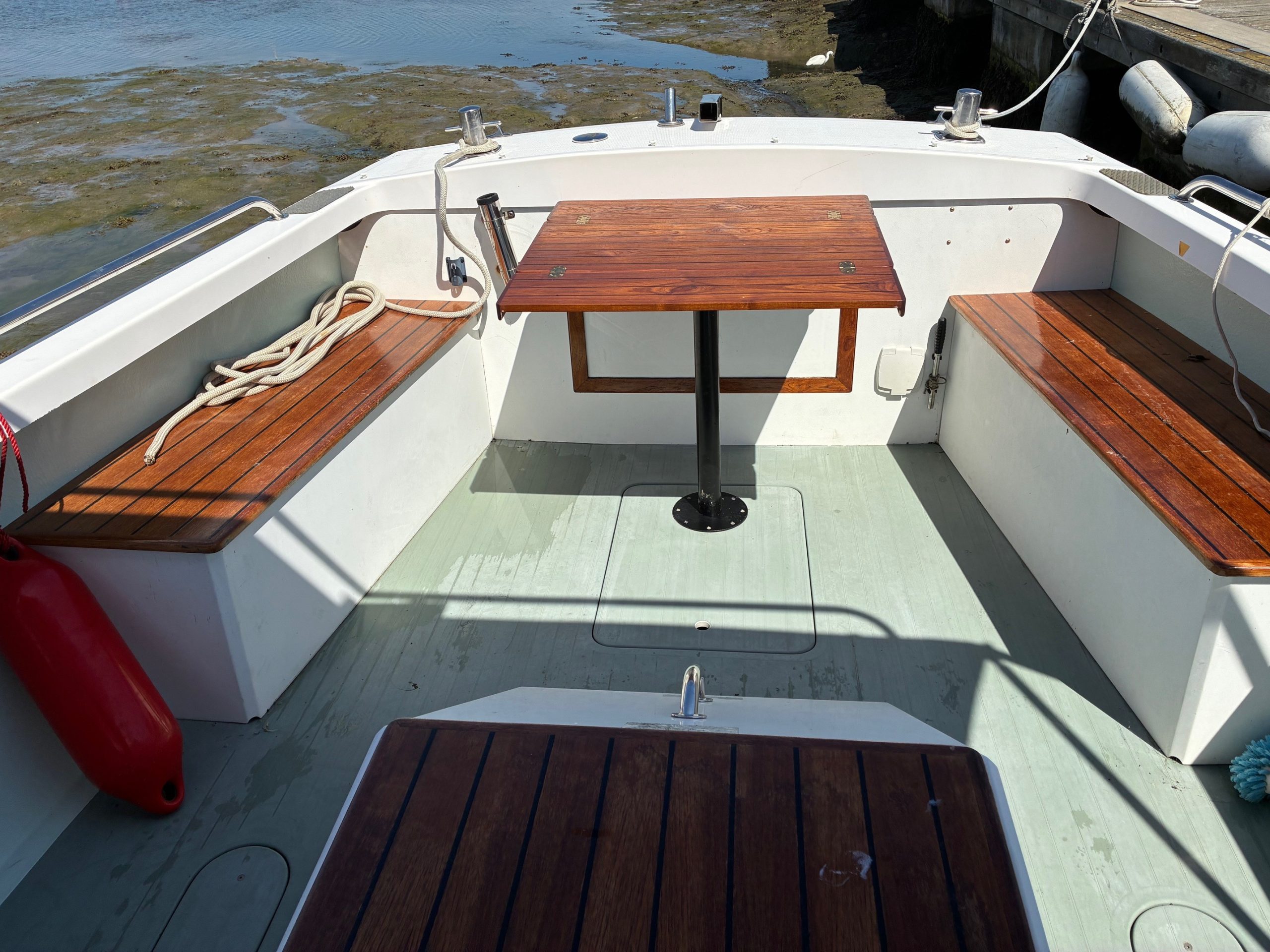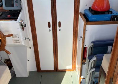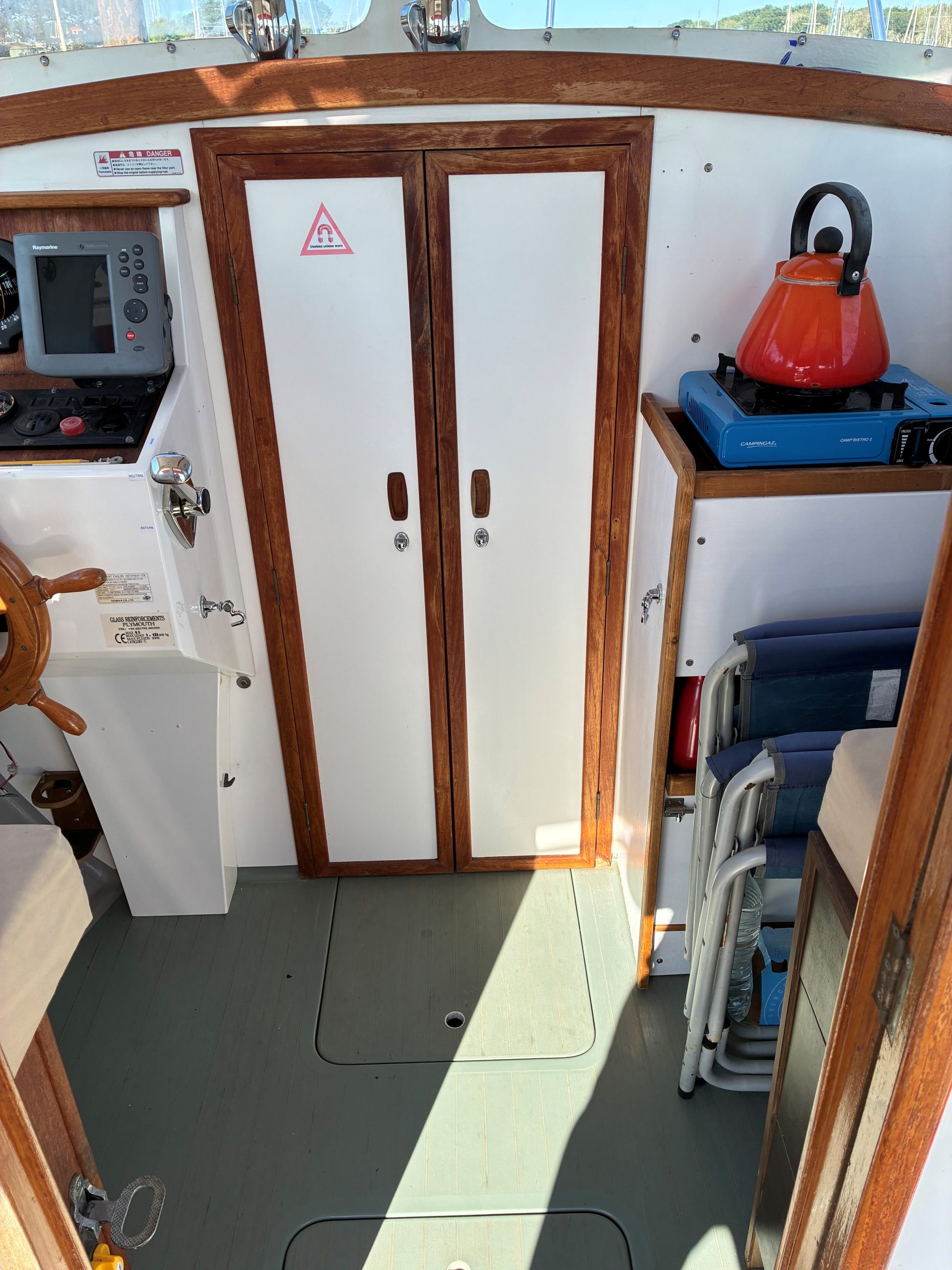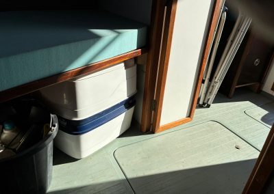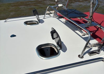 Cabin: Has a Vetus hatch that allows access to the foredeck. Single bunk with disposable toilet stored beneath. Self-draining anchor lockers for warp and chain. Also has a folding Teak table and support post.